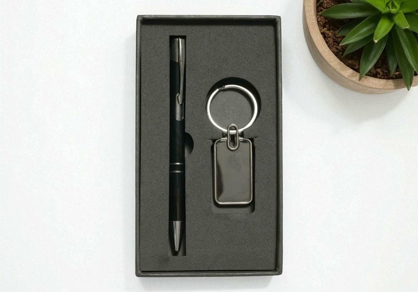 Sleek office set featuring a rectangular gunmetal/black metal keychain and a matching black metal ball pen.