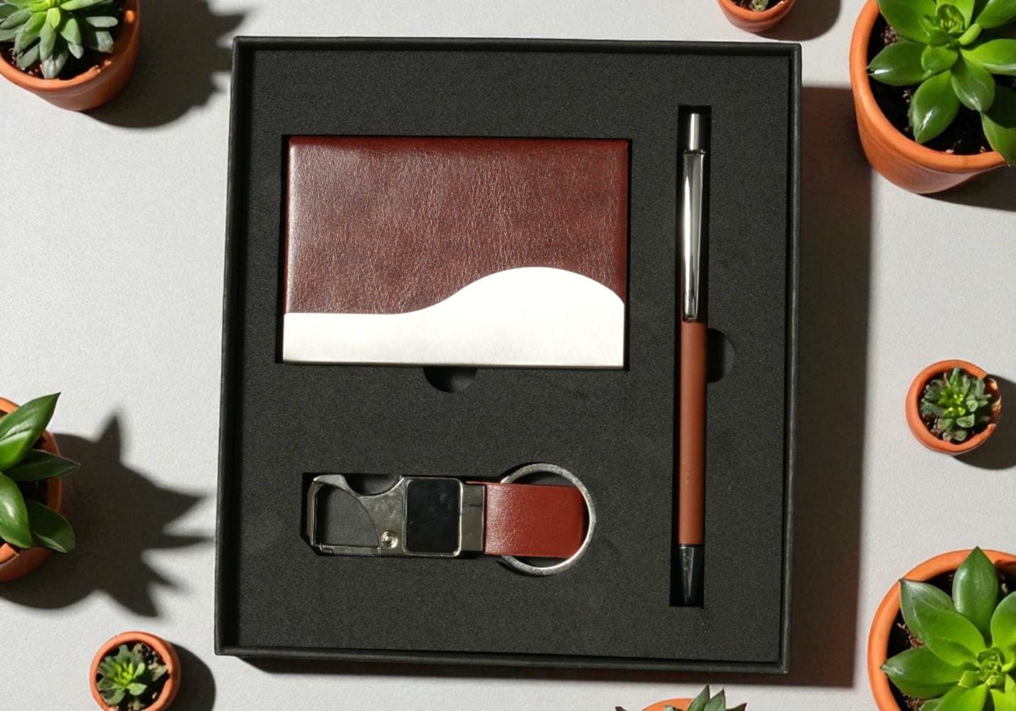 Elite 3-piece set in tan brown featuring a PU leather card holder with metal wave detail, a brown keychain, and a matching brown metal pen.