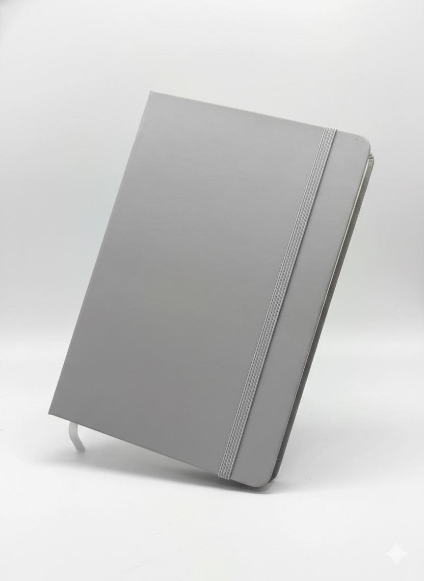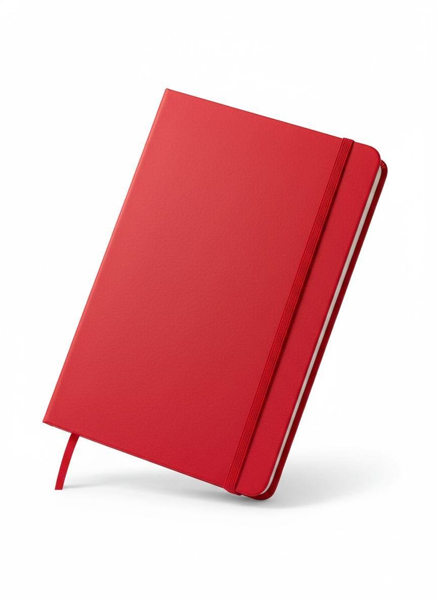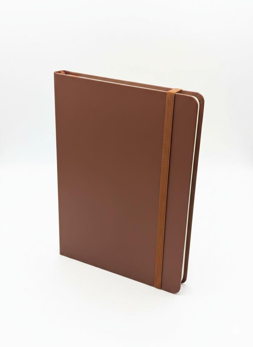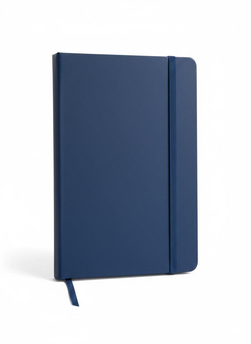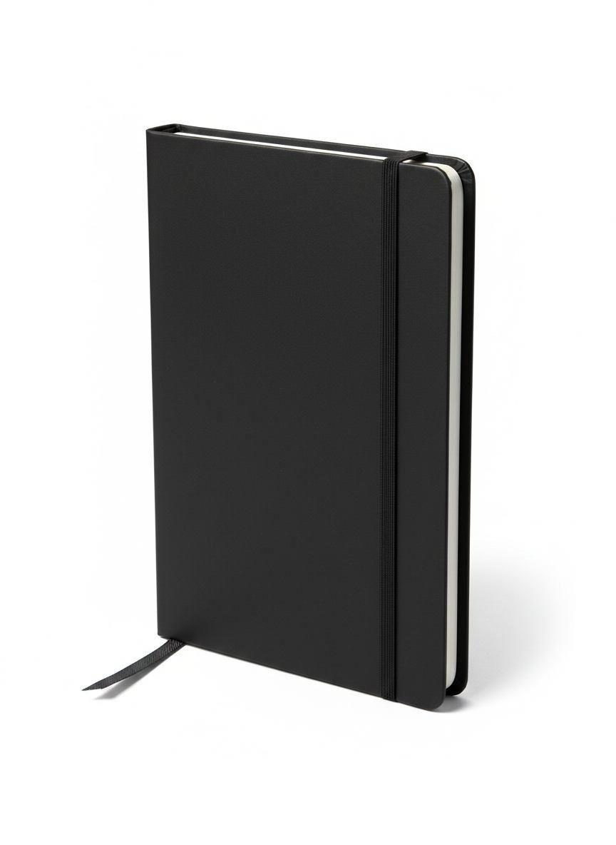 Professional-grade notebook featuring a durable finish with a standard vertical elastic band for secure closure. Includes a color-coordinated ribbon bookmark. Available in Black, Navy Blue, Red, Grey, and Brown.